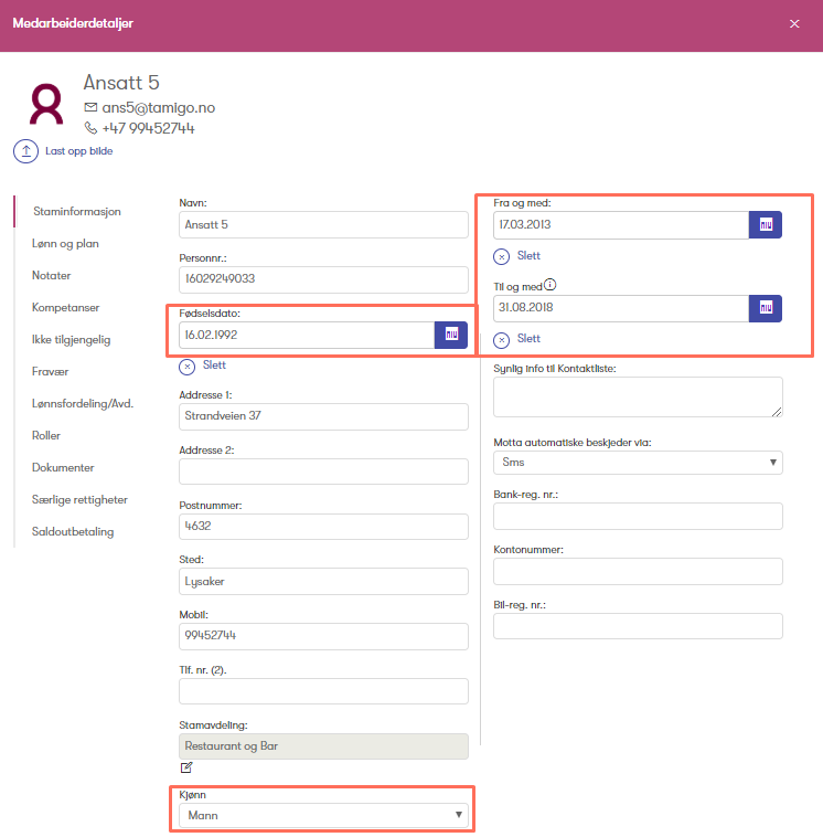 Basis innstilling er: Start dato / slutt dato registreres på hver medarbeider.