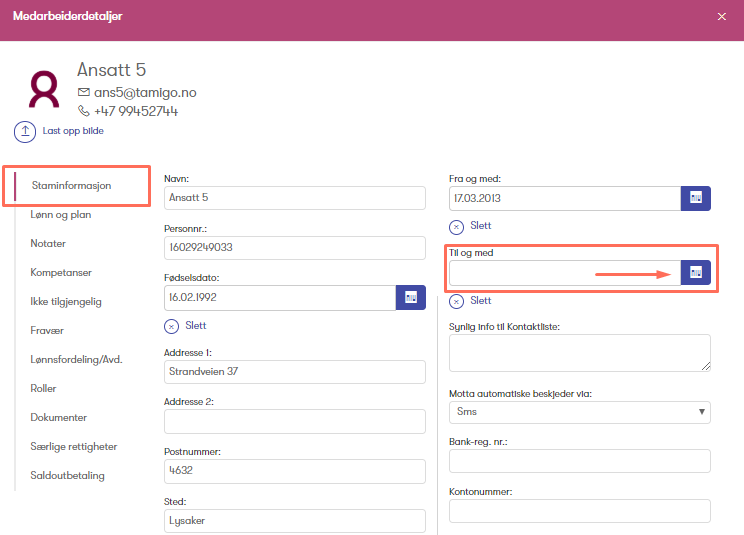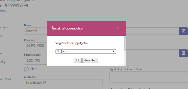 Får å legge til en årsak til oppsigelsen når den ansatte slutter, må man først legge til en sluttdato på den gjeldene. Dette gjøres ved å gå til fanen "Ansatte", trykk så på navnet til medarbeideren som skal slutte, og du vil få opp en ny boks med Medarbeiderdetaljer. Tilføy en sluttdato på medarbeidere som vist på bildet, og du vil da få opp spørsmål om hva som er oppsigelseskårsaken til denne medarbeideren, velg så riktig årsak og avslutt med å Lagre endringene.