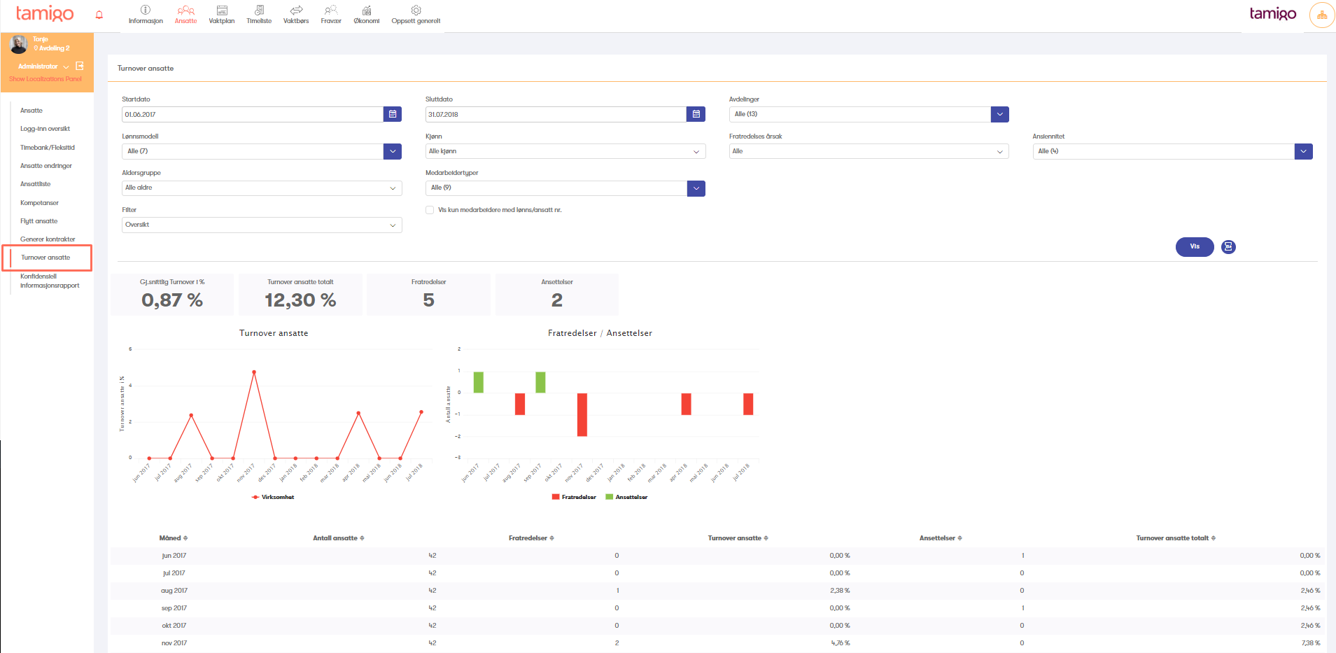 Kanskje ikke ofte man har behov for en Turnover rapport. Men i tamigo kan du hente ut Turnover rapport når du ønsker det, på mindre enn ett minuttet.