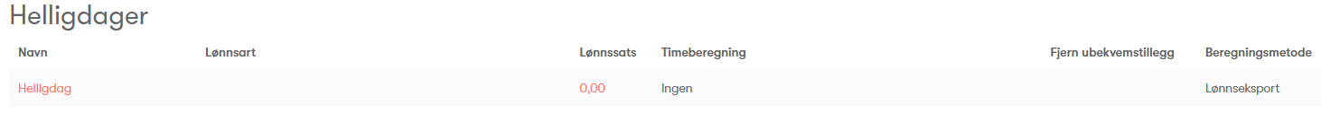 b.) I lønnsmodellene er/eventuelt må Helligdager være definert (se bildet under). For virksomheter som har åpent på enkelte helligdager, er dette satt (med Lønnsart), men for andre må også Helligdager opprettes (men da uten lønnsart)