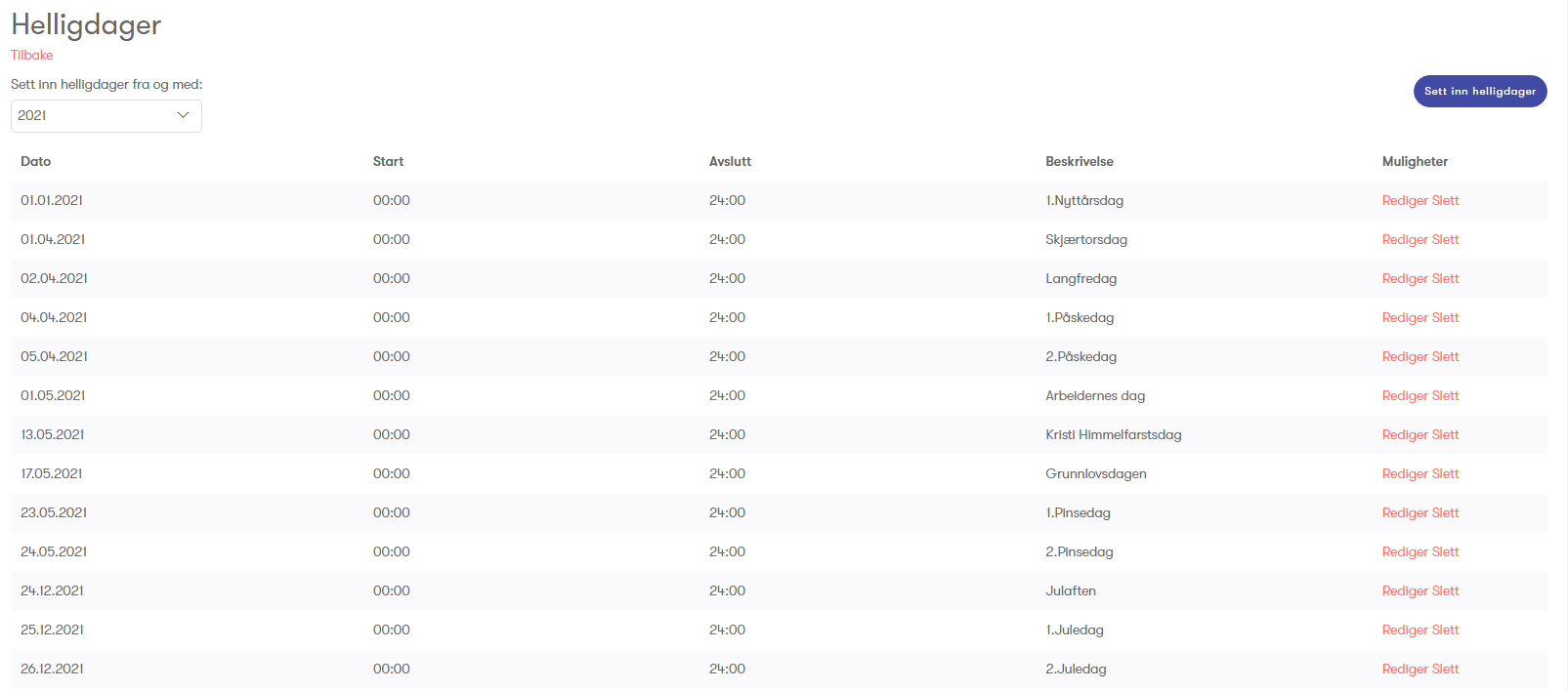 Det er viktig å merke seg at det kun er Helligdager definert mellom kl. 00-24som gjelder.
