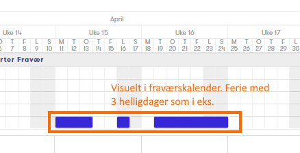 For eksempel dersom en ansatt tar 2 ukers ferie fra mandag i påskeuken til og med søndag etter påskeuken.